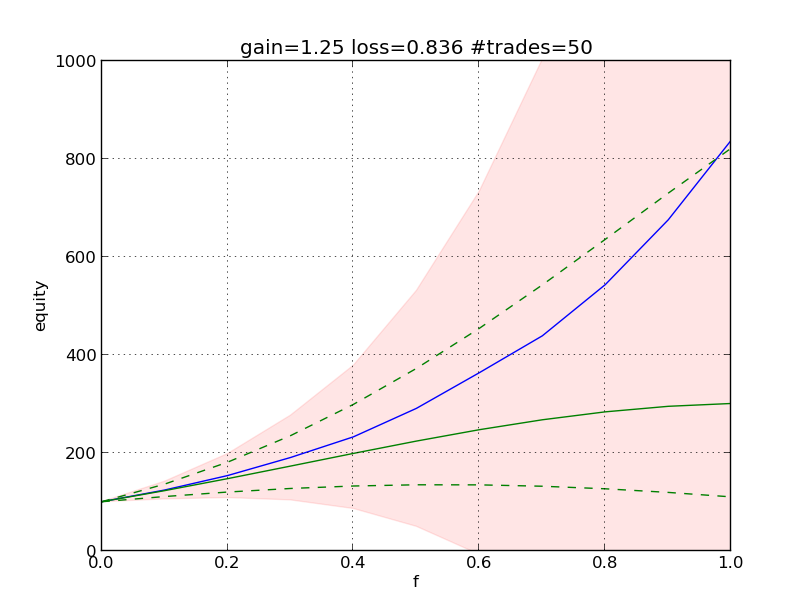 So, if you were offered one of these three systems, what would you do? You could elect the first one, where pg=1.3 and pl=0.77. Trading using this system with f=0.3 you will obtain E>1.25·Eo in 75% of the occasions. Do NOT trade this system with f=1!